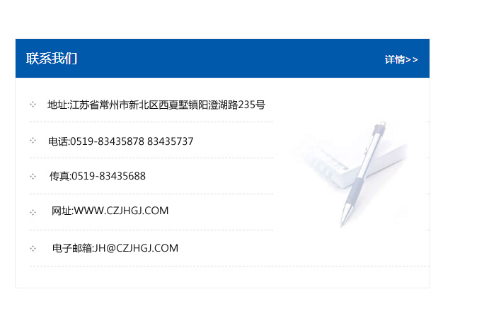 傳真:0519-83435688    郵編:213135    網址:WWW.czjhgj_com.wangyintianxia.com    電子郵箱:JH@czjhgj_com.wangyintianxia.com